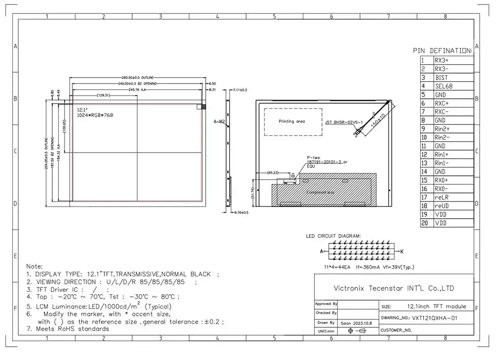 TFT LCD är en typ av flytande kristallskärm som använder tunnfilmtransistor teknik för att förbättra bildkvaliteten och den har ett brett utbud av applikationer i livet. Som en professionell TFT -modultillverkare och leverantör i Kina, vad gör Victronix 12,1 tum 1024*768 utomhus IPS TFT -modul annorlunda än andra tillverkare? Till att börja med garanterar dess IPS-teknik konsekvent färg och tydlighet med en 85-graders betraktningsvinkel från alla riktningar, 1000 CD/m² typisk ljusstyrka och ett högt typiskt kontrastförhållande på 1000: 1. För det andra integrerar den en bakgrundsbelysning som använder 11S4P-LED med en typisk livslängd på 30 000 till 50 000 timmar (till 50% initial ljusstyrka), vilket säkerställer tydlig synlighet under alla ljusförhållanden. Dessutom stöder den 6-bitars/8-bitars färgdjup (valbar via SEL68-stift) med displayorienteringskontroll. Dessutom klarar den rigorös miljötestning inklusive hög/låg temperaturförvaring och drift, temperaturcykling och hög temperatur/fuktighet, vilket säkerställer att man arbetar pålitligt inom ett omfattande temperaturintervall av -20 ° C till +70 ° C och motståndar lagring under samma hårda förhållanden.