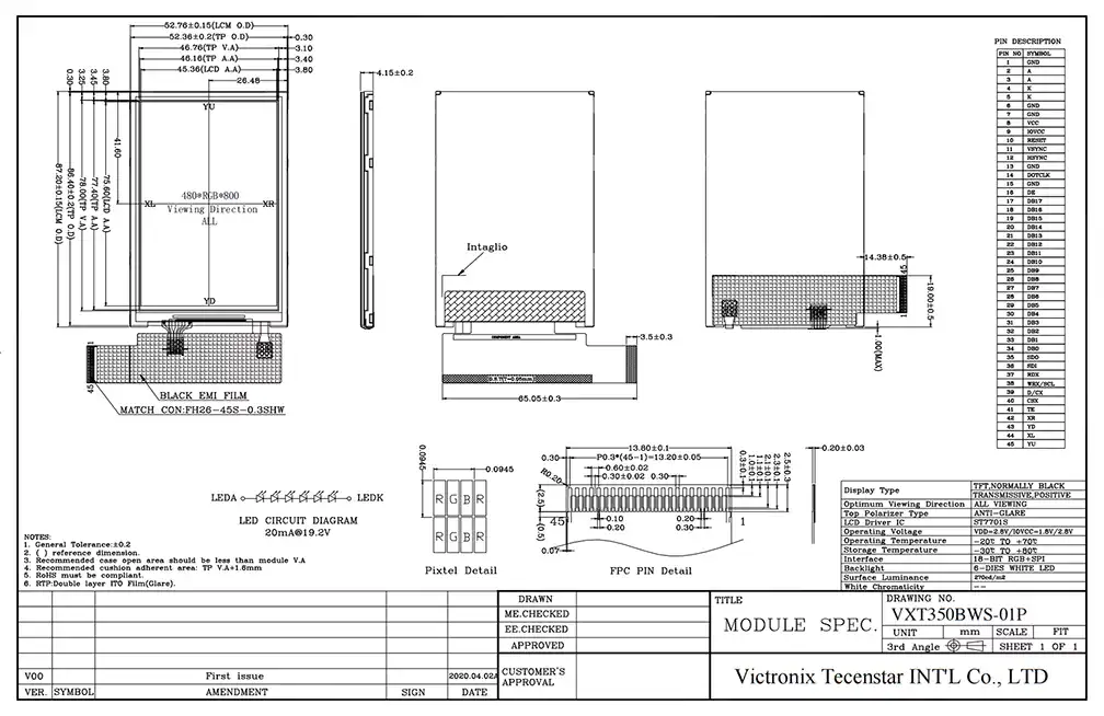 Pekskärmen är en skärm som upptäcker en användares beröringsinmatning, vilket gör att användaren kan interagera direkt med det visade innehållet utan behov av en mus, pekplatta eller annan liknande enhet. Det används ofta i smartphones, surfplattor, bärbara datorer och andra elektroniska enheter. Som en professionell TFT -modultillverkare och leverantör i Kina, vad är fördelarna med denna Victronix 3.5 '' 480x800 IPS Resistive Touch TFT -modul? Till att börja med erbjuder det en typisk ljusstyrka på 270 CD/m² och ett högt kontrastförhållande på 1000: 1 för att säkerställa konsekvent färg och tydlighet. För det andra stöder det konstruktion: ITO-film (reporistent glansyta) + 0,7 mm härdat glas (total tjocklek: 1,15 ± 0,05 mm). Dessutom har den ett 6-dags vitt LED-bakgrundsbelysningssystem med en livslängd på 50 000 timmar, vilket upprätthåller 50% ljusstyrka för att säkerställa långsiktig användbarhet i olika industriella applikationer. Dessutom klarar den stränga miljöstresstester, inklusive hög/låg temp-drift och lagring, fuktigt värme, termisk chock (± 30 ° C/± 80 ° C), ESD (± 8kV luft/± 4 kV kontakt), vibration, mekanisk chock och dropptest för att använda tillförlitligt i extremt temperaturer (-20 ° C till +70 ° C).