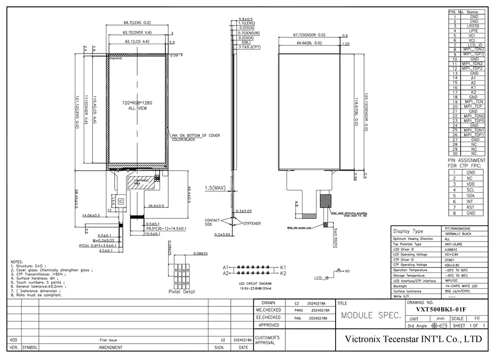 Vilka är fördelarna med Victronix 5 tum 720x1280 IPS TFT -modul i konkurrenssituationen för TFT -modultillverkare? Till att börja med uppnår den en typisk luminans på 850 CD/m² (med högst 1200 CD/m²) och ett kontrastförhållande på 1200: 1, vilket säkerställer utmärkt synlighet även i utmanande ljusförhållanden. För det andra har den ett 14-dags vitt LED-bakgrundsbelysningssystem med en typisk livslängd på 50 000 timmar (till 50% initial ljusstyrka), vilket säkerställer tydlighet och utökad användning i olika ljusförhållanden. Dessutom validerades det genom IEC-standardtester inklusive termisk chock (-30 ° C ↔ +85 ° C), fuktförvaring (60 ° C/90% RH) och vibrationsmotstånd mot att fungera sömlöst över ett utökat temperaturintervall (-20 ° C till +80 ° C). Dessutom stöder dess MIPI DSI-gränssnitt fyra datanfält för höghastighetsvideoöverföring på upp till 850 Mbps. Den har en 5-punkts kapacitiv pekskärm med en G+G-struktur och en hårdhetsgrad på minst 6 timmar. Den har ett I²C -gränssnitt med GT967 -drivrutinen och innehåller en ZIF -kontakt.