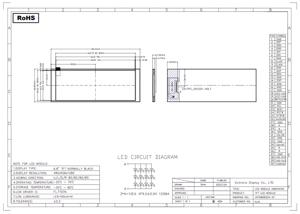 TFT LCD är en typ av flytande kristallskärm som använder tunnfilmtransistorteknologi för att förbättra bildkvaliteten, och den har många tillämpningar i vardagen. Som en professionell TFT -modultillverkare och leverantör i Kina, vad gör Victronix 6,86 tum 480 × 1280 IPS TFT -modul annorlunda än andra tillverkare? Till att börja med erbjuder det en typisk ljusstyrka på 450CD/m², 16,7 m färger, en bred betraktningsvinkel på 80 ° (typisk) i alla riktningar och ett kontrastförhållande på 800: 1, vilket säkerställer utmärkt läsbarhet från olika vinklar. För det andra integrerar den en bakgrundsbelysning med 3 × 4 vita lysdioder med en typisk livslängd på 30 000 till 50 000 timmar (till 50% initial ljusstyrka), vilket säkerställer tydlig synlighet under alla ljusförhållanden. Dessutom använder den ett 4-lan MIPI DSI-gränssnitt för höghastighetsdataöverföring och förenklad integration. Dessutom klarar den rigorös miljötestning, inklusive hög/låg temperaturlagring och drift, temperaturcykel, fuktig värme (fuktighet) testning så att den kan fungera sömlöst över ett utökat temperaturområde från -20 ° C till +70 ° C.