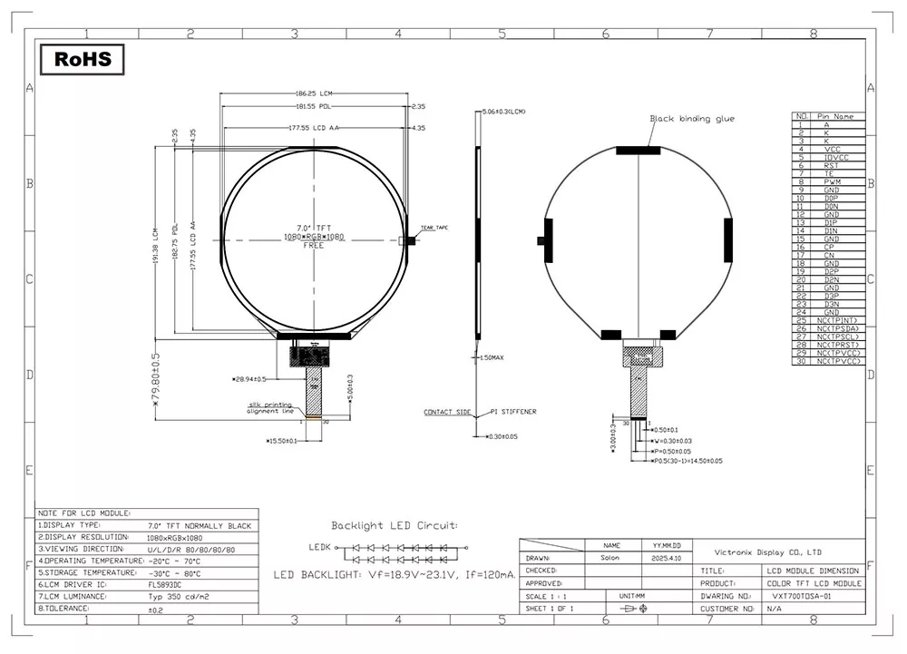 TFT -modul finns överallt i livet. Vad gör denna Victronix 7 tum 1080 × 1080 Round IPS TFT LCD annorlunda än andra tillverkare? Till att börja med säkerställer dess 500 CD/m² ljusstyrka, 800: 1 -kontrastförhållande och betraktningsvinklar på 80 ° i alla riktningar. För det andra stöder enheten ett 4-spårs MIPI-gränssnitt med FL5893DC-styrenheten för höghastighetsdataöverföring. Dessutom har den en 32 vit LED -bakgrundsbelysning med en livslängd på 30 000 till 50 000 timmar, vilket säkerställer tillförlitlig prestanda i olika industriella applikationer. Dessutom uppfyller den ROHS-standarder och klarar rigorösa tillförlitlighetstester (termisk chock, luftfuktighet, lagring) för att fungera felfritt i extrema temperaturer (-20 ° C till +70 ° C) och tål hårda lagringsförhållanden (-30 ° C till +80 ° C).