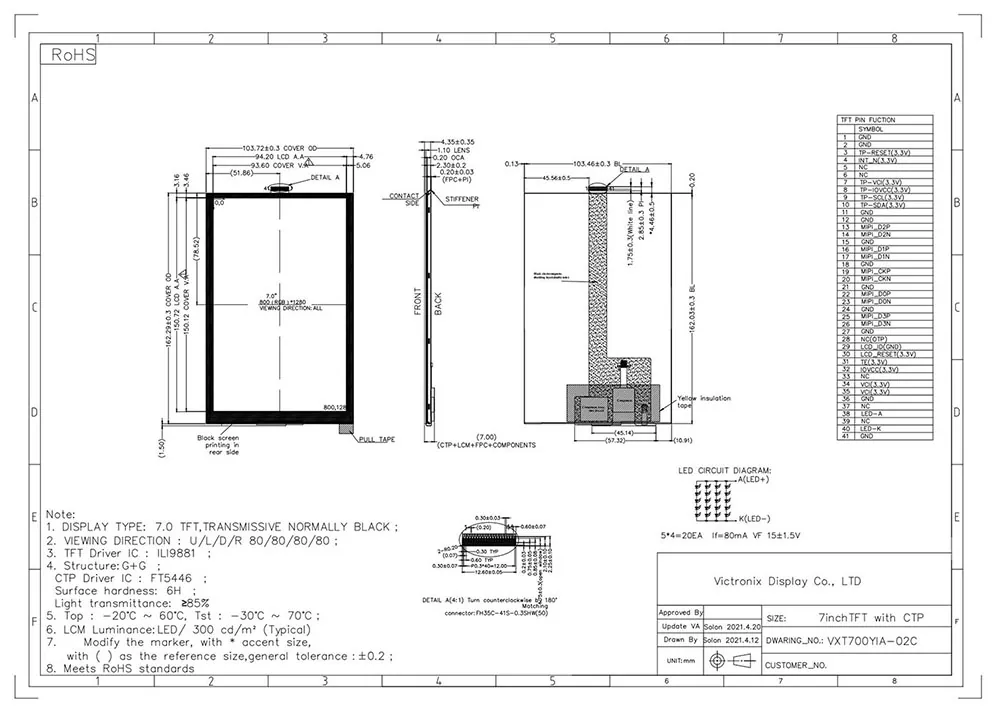 VXT700YIA-02C är en TFT-LCD-modul. Den består av en TFT-LCD-panel, förar IC, FPC, ett bakljus och CTP. Displayområdet 7,0 ¢ innehåller 800 x (RGB) x 1280 pixlar och kan visa upp till 16,7 m färger. Denna produkt överensstämmer med ROHS miljökriterium ..