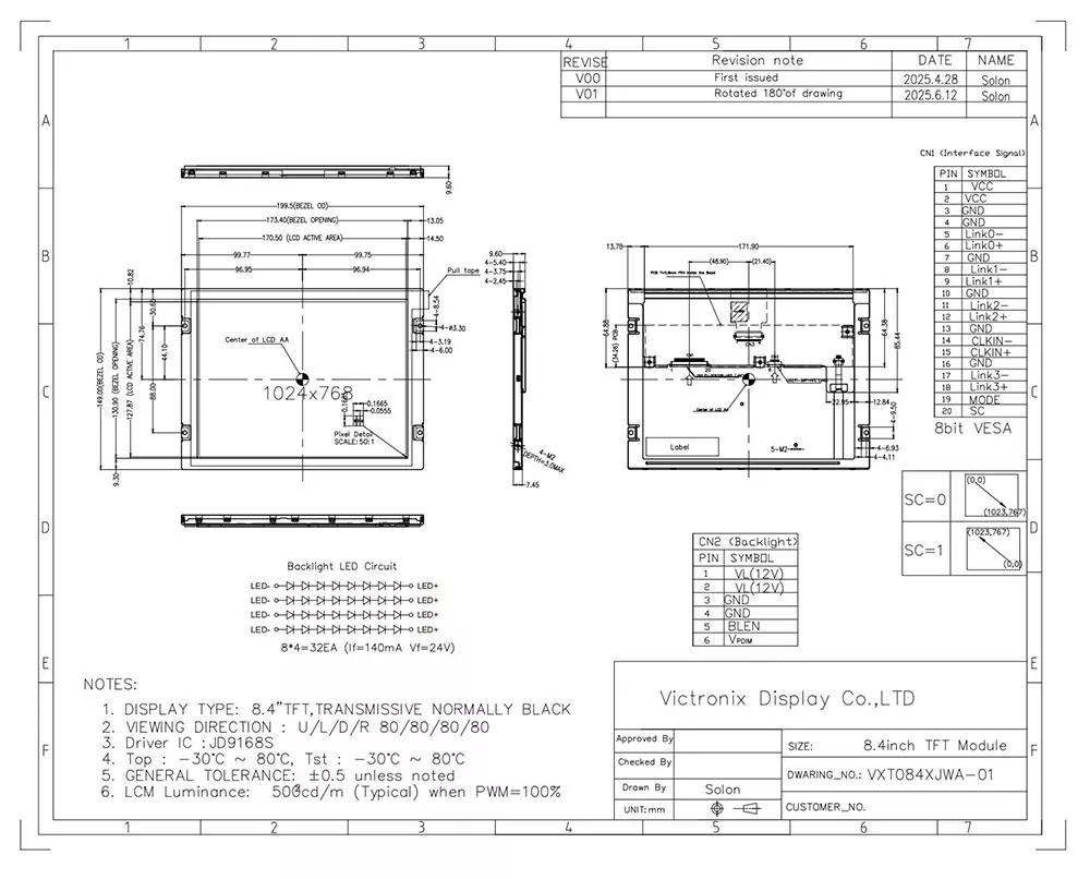 TFT LCD är en typ av flytande kristallskärm som använder tunnfilmtransistorteknologi för att förbättra bildkvaliteten, och den har många tillämpningar i vardagen. Som en professionell TFT -modultillverkare och leverantör i Kina, vad gör Victronix 8,4 tum 1024 × 768 IPS TFT LCD annorlunda än andra tillverkare? För det första erbjuder det en typisk ljusstyrka på 500 CD/m², 85 ° bredt betraktningsvinklar i alla riktningar och ett kontrastförhållande på 1500: 1, vilket säkerställer utmärkt läsbarhet från olika vinklar. För det andra integrerar den en bakgrundsbelysning med 32 vita LED med en typisk livslängd på 50 000 timmar (till 50% initial ljusstyrka), vilket säkerställer tydlig synlighet i alla ljusförhållanden. Besides, it supports LVDS interface with ESD protection and JD9168S controller. Dessutom klarar den rigorös miljötestning, inklusive termisk chock (-30 ° C ↔ +80 ° C-cykler), luftfuktighetslagring (60 ° C/90% RH) och mekanisk vibration, vilket säkerställer att den kan fungera sömlöst över ett utökat temperaturintervall (-30 ° C till +80 ° C).